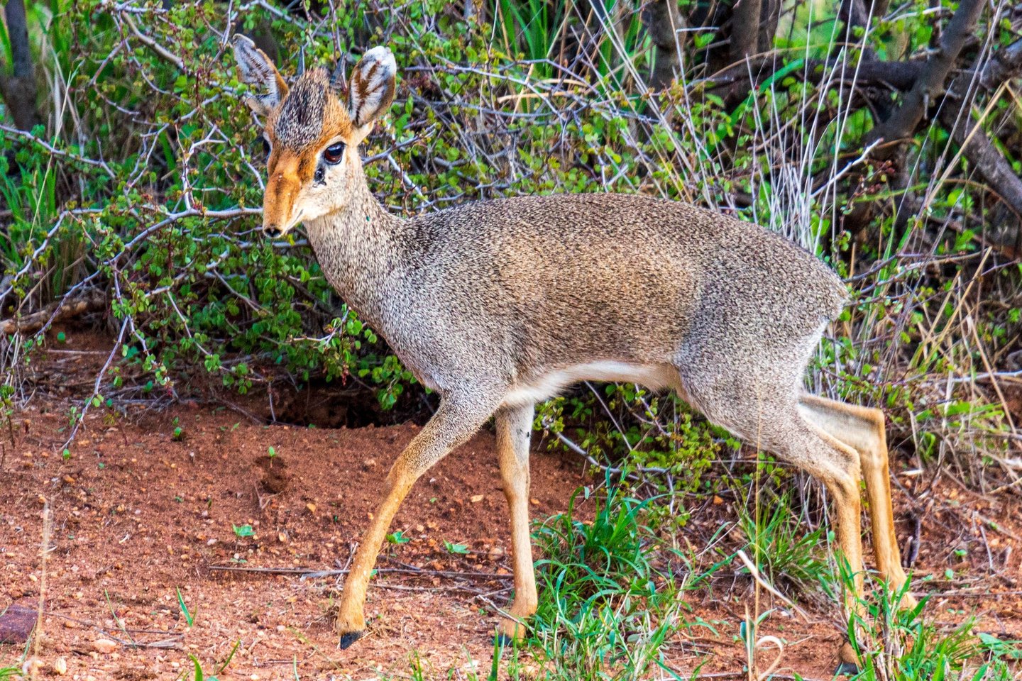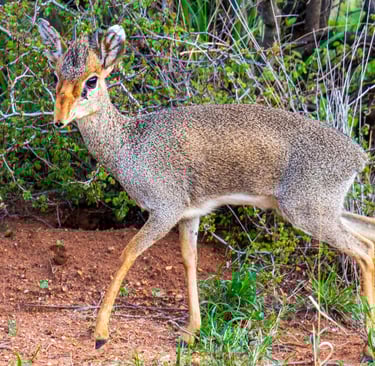 Meet the dik-dik — one of the smallest antelopes in Africa, and arguably the most charming. This one was spotted in the bush at Lewa Conservancy, Kenya, October 2019. Standing only about 16 inches tall at the shoulder, dik-diks are monogamous and mate for life, which somehow seems fitting for an animal this endearing. The name comes from the alarm call the female makes when startled — a sharp, repeated "dik-dik" sound.
