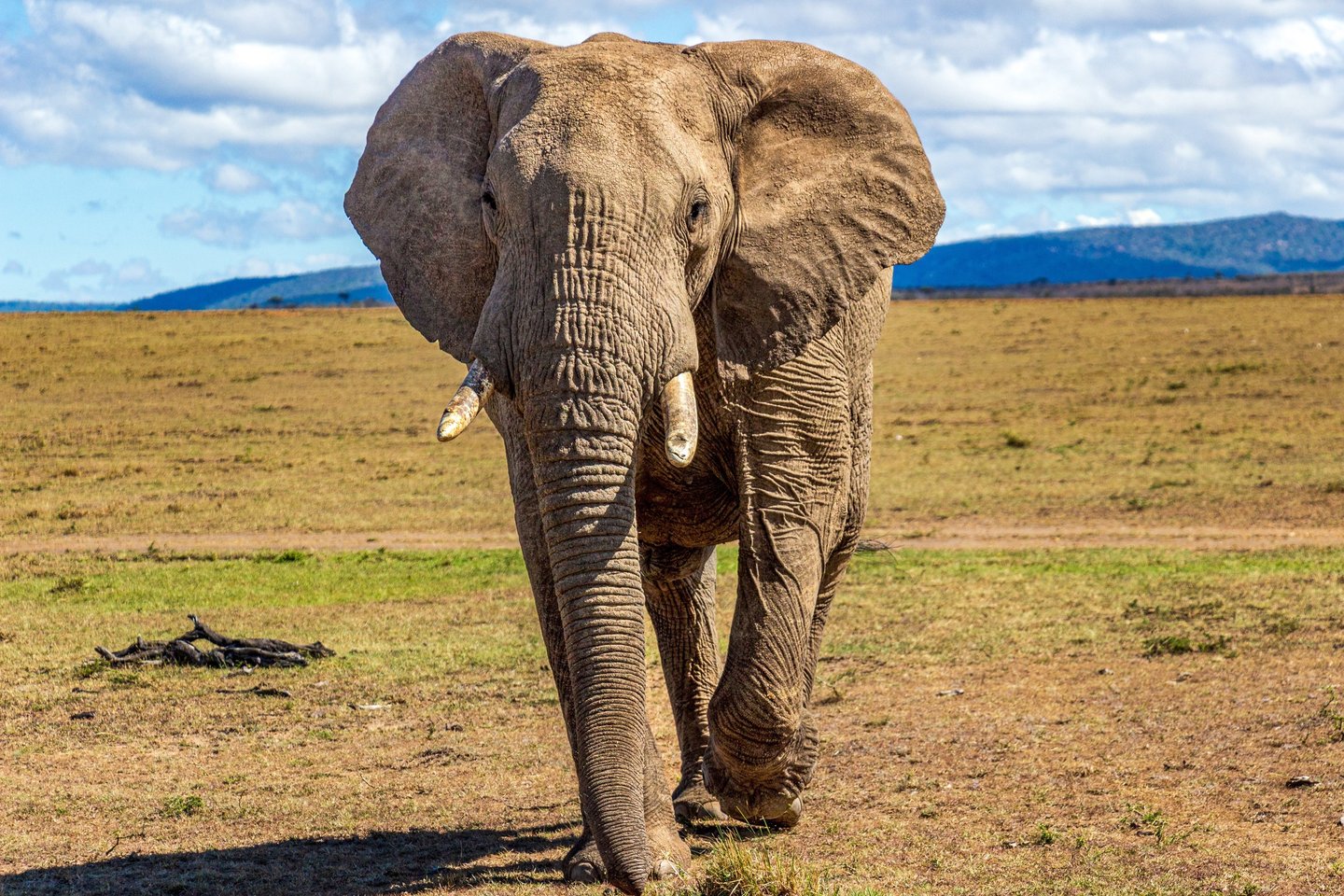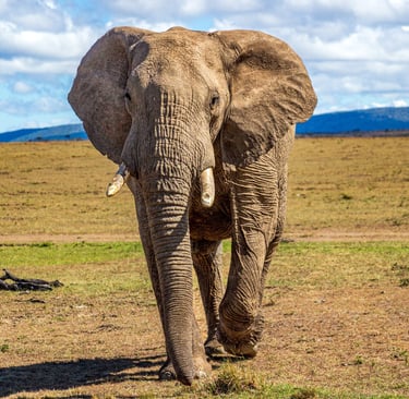 An African elephant walks directly toward us on the open savanna of the Mara Naboisho Conservancy, Kenya, August 2022. The largest land animal on earth, African elephants can weigh up to 14,000 pounds and live for 70 years. This one didn't seem concerned about us in the least — which, given the size difference, seems about right.