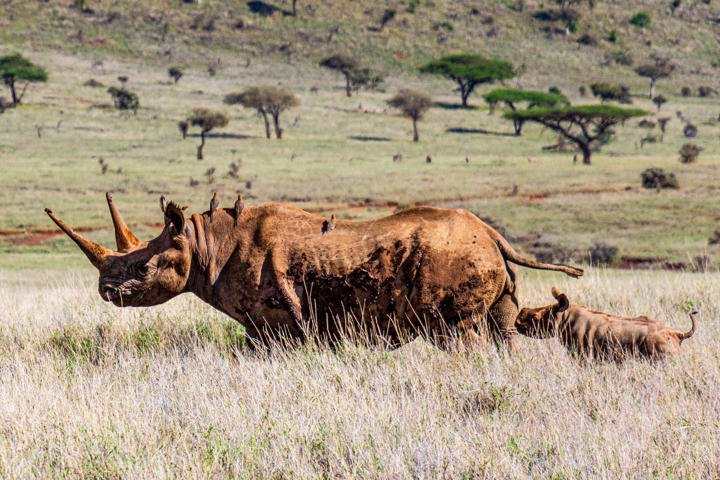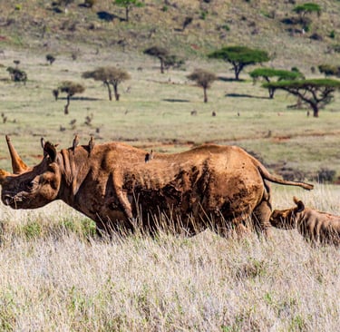A black rhinoceros mother walks the savanna at Lewa Conservancy, Kenya, October 2019, her calf close behind. This photo was taken moments after she charged our safari vehicle — head down, full speed — stopping just inches from the bumper. We weren't sure she was going to stop. She was just being a protective mother, but it was an extremely effective reminder that black rhinos are among the most territorial and unpredictable animals in Africa. Fewer than 6,000 remain in the wild.