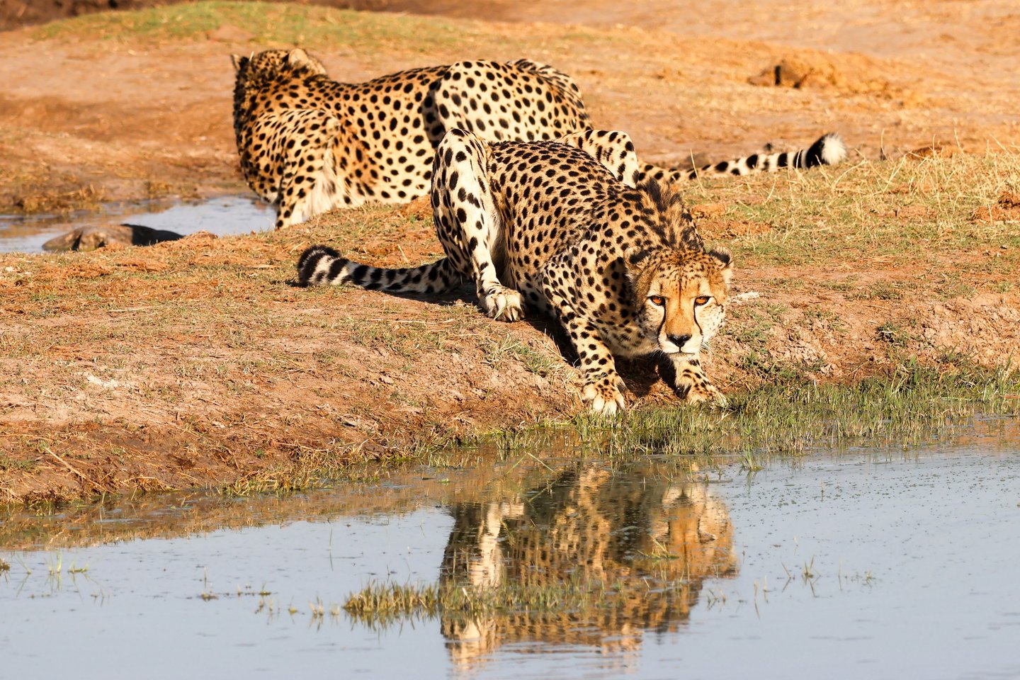Two cheetahs pause at a watering hole in Hwange National Park, Zimbabwe, August 2024. One keeps watch while the other drinks — a classic division of labor that helps keep both animals alive. Even at rest, the focus in those eyes is unmistakable. The fastest land animal on earth, cheetahs can accelerate from zero to 70 miles per hour in just three seconds — but speed alone doesn't guarantee survival. Fewer than 7,000 remain in the wild.