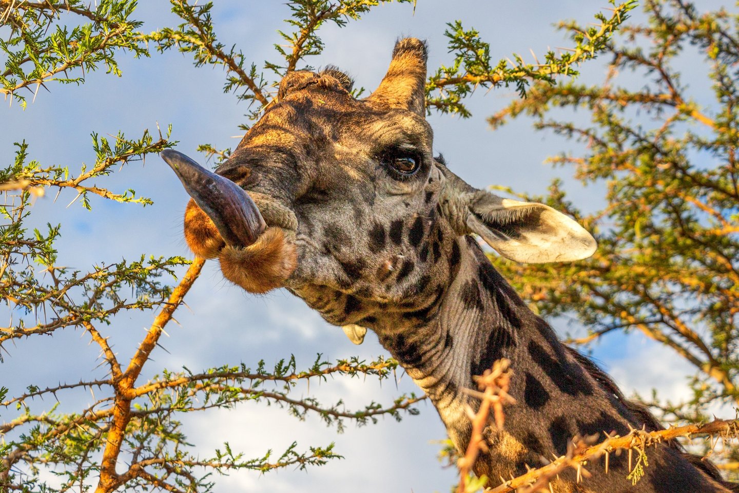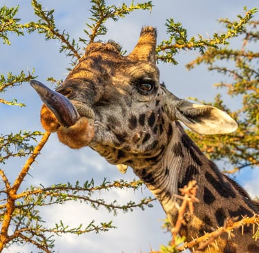 A hungry giraffe helps himself to lunch from an acacia tree in the Mara Naboisho Conservancy, Kenya, 2019. That extraordinary tongue — which can reach 18 inches long — is perfectly designed for stripping leaves from thorny branches. The dark color is thought to protect it from sunburn during all those hours of outdoor dining. He doesn't seem particularly bothered by the camera.