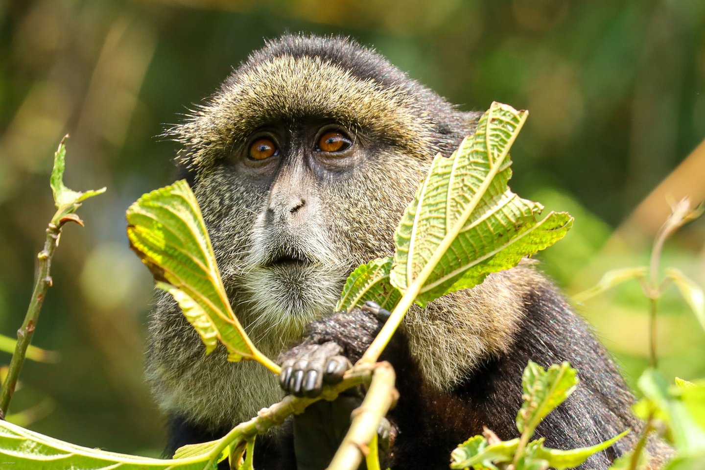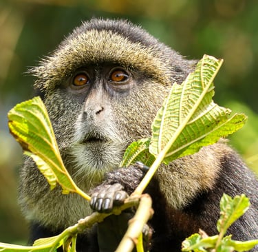 A golden monkey peers through the foliage in Volcanoes National Park, Rwanda, August 2022. We had come to the park to track mountain gorillas — and the gorillas didn't disappoint — but the golden monkeys were an unexpected bonus. Found only in the Virunga volcanic mountains shared by Rwanda, Uganda, and the Democratic Republic of Congo, golden monkeys are themselves an endangered species. It's hard to look at that face and not feel the connection.