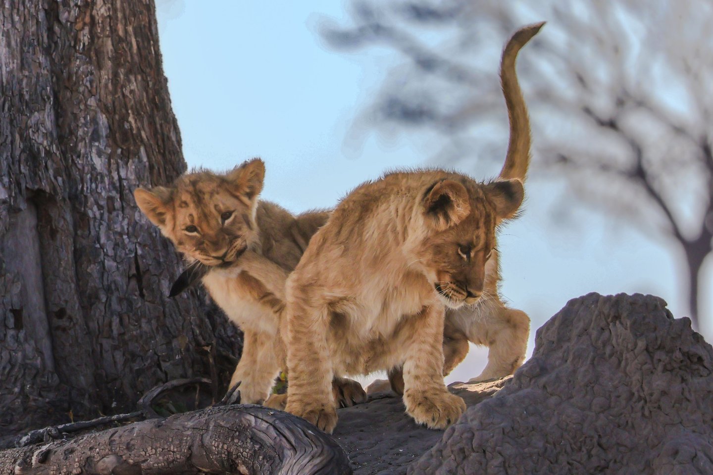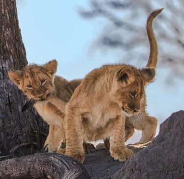 Two lion cubs at play in Hwange National Park, Zimbabwe, August 2024 — one of them has grabbed his sibling's tail and isn't letting go. It looks like pure mischief, but this kind of rough-and-tumble is exactly how young lions develop the coordination and instincts they'll need as adults. For now though, it's just fun.