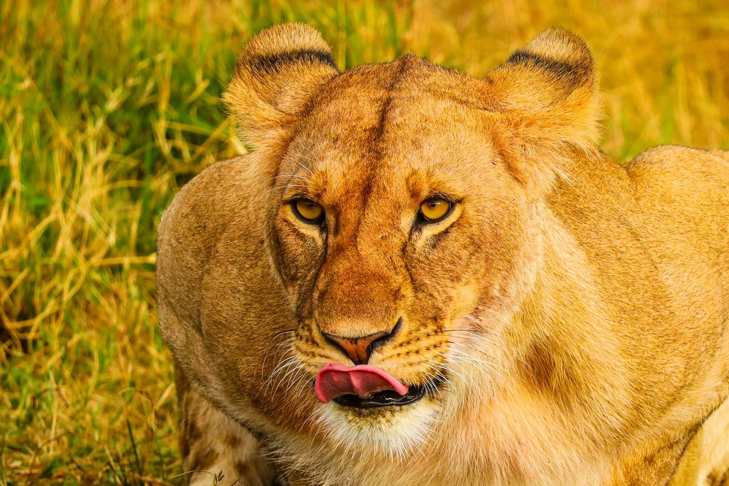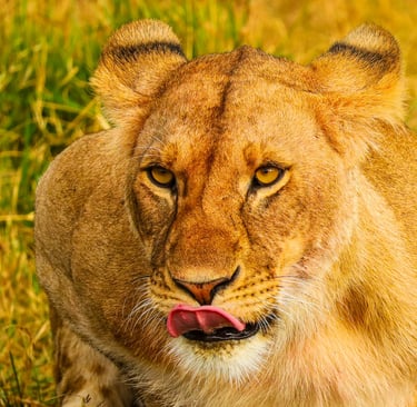 A lioness fixes us with her gaze in the Mara Naboisho Conservancy, Kenya, August 2022. The lip-lick is either a sign of contentment — or she's thinking about lunch. We chose not to ask which.