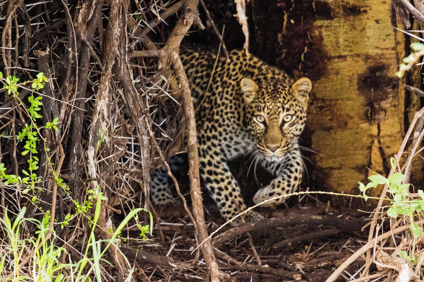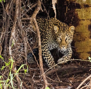A leopard emerges from his den in the bush at Lewa Conservancy, Kenya, October 2019 — and looks us directly in the eye. We almost missed him entirely. Just after our encounter with the charging rhino, our guide noticed a group of monkeys in the trees nearby, all pointing downward toward the same spot. He positioned the vehicle accordingly, and we waited. And waited. He repositioned. We waited some more. Then, without warning, this leopard stepped out of the shadows, stared at us for a long moment, walked calmly past the vehicle, and disappeared into the distance at a run. The whole encounter lasted less than a minute. Leopards are notoriously elusive — many experienced safari-goers never see one in the wild. We got lucky.