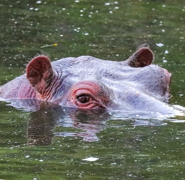 A hippopotamus keeps a wary eye on the world from the cool water of a river in the Mara Naboisho Conservancy, Kenya, 2022. Hippos spend most of the day submerged like this, protecting their sensitive skin from the sun. That reddish tinge around the eye isn't blood — it's a natural secretion that acts as both sunscreen and antiseptic. Don't let the placid scene fool you: Hippos are considered among the most dangerous animals in Africa.
